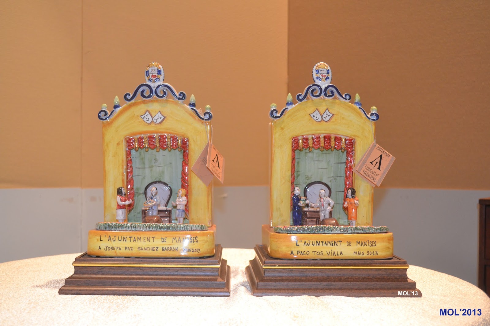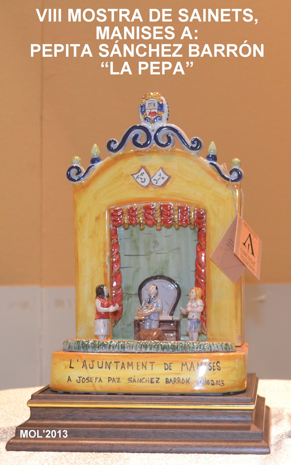 El acto organizado por el Ayuntamiento de Manises tiene lugar en dos partes, mejor dicho en dos días. El Viernes es el día en el que tiene lugar los homenajes, donde se proyecta un vídeo con las imágenes de la trayectoria de cada uno de los homenajeados. También se les hace entrega de la figura de cerámica que representa un escenario con actores y actrices como si estuvieran actuando. Cuando terminan los homenajes actúa el grupo de teatro con el sainet o comedia preparada.